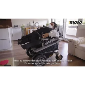 Dank unseres Elektrorollstuhls COSEATfly kann Mehmet auch liegend unterwegs sein – sowohl in der Wohnung als auch draußen. Eine besondere Herausforderung dabei war, Mehmets Gesicht bei Sonnene und im Regen zu schützen.